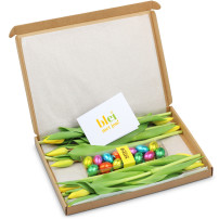 Verras collega's, vrienden of familie met dit vrolijke pakket gevuld met uitsluitend gele tulpen. Daarnaast bevat het brievenbuspakketje ook nog een doosje luxe chocolade paaseitjes. Gele tulpen zijn een populaire keuze tijdens de Paasdagen. In een vaas komen ze mooi tot hun recht en geven, met de juiste verzorging, minsten een week plezier! Iedere woonkamer, eettafel of keuken zal direct opfleuren met deze frisse, gele tulpen. Maar ook op een kantoorbureau zullen ze zeker niet misstaan!